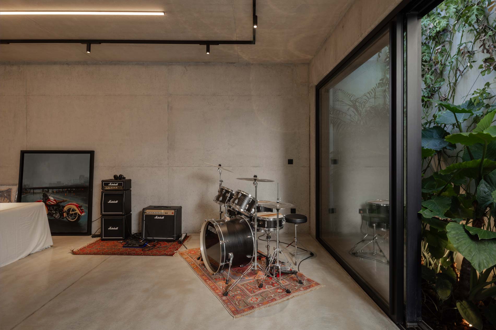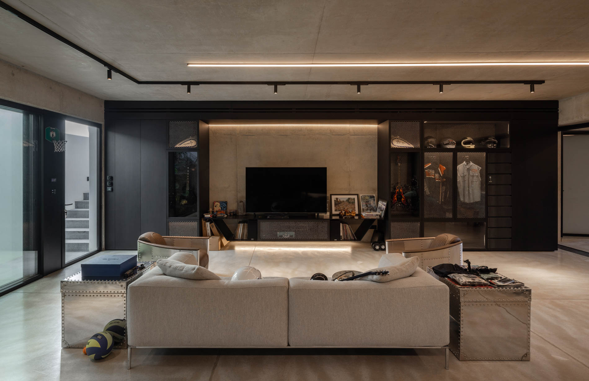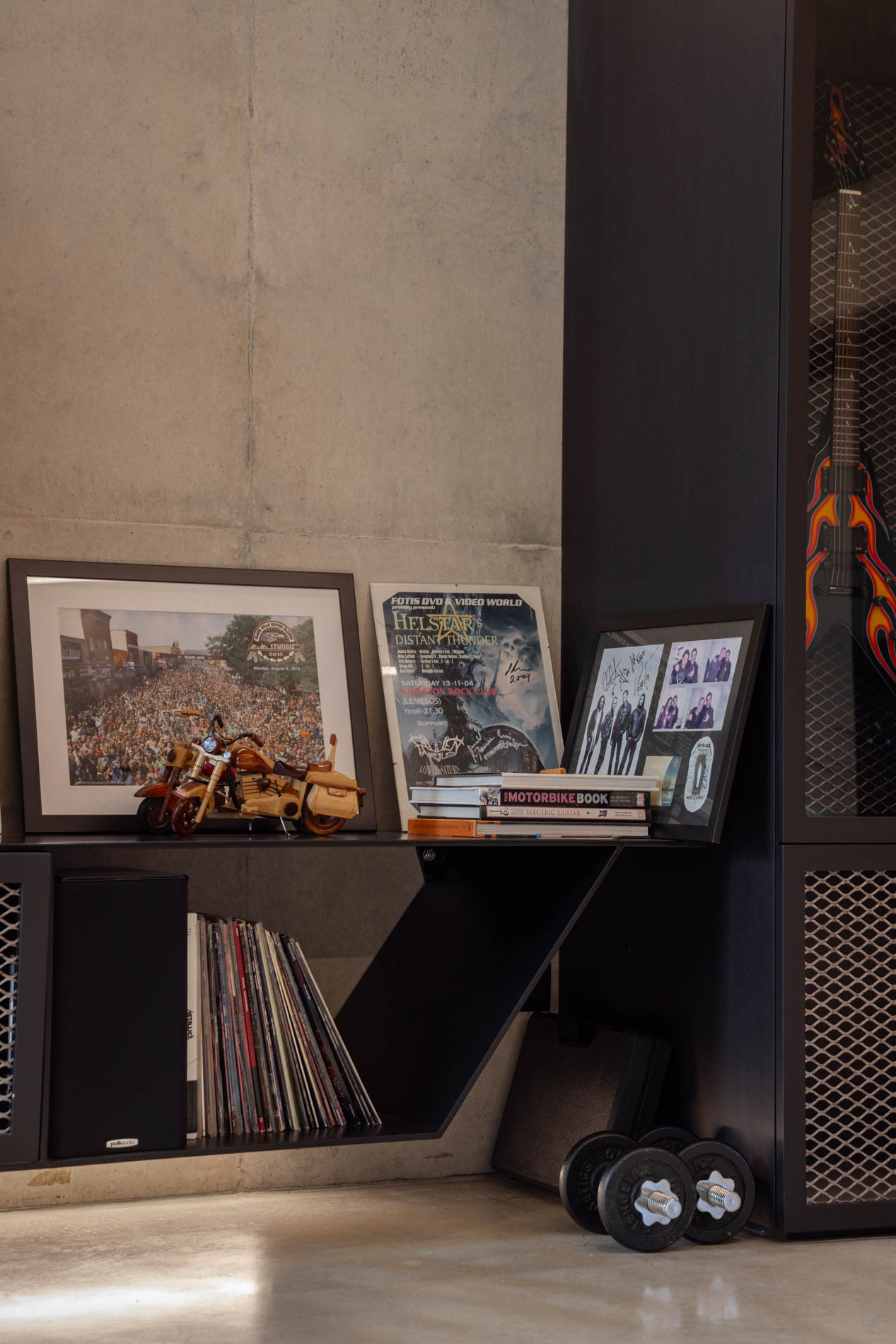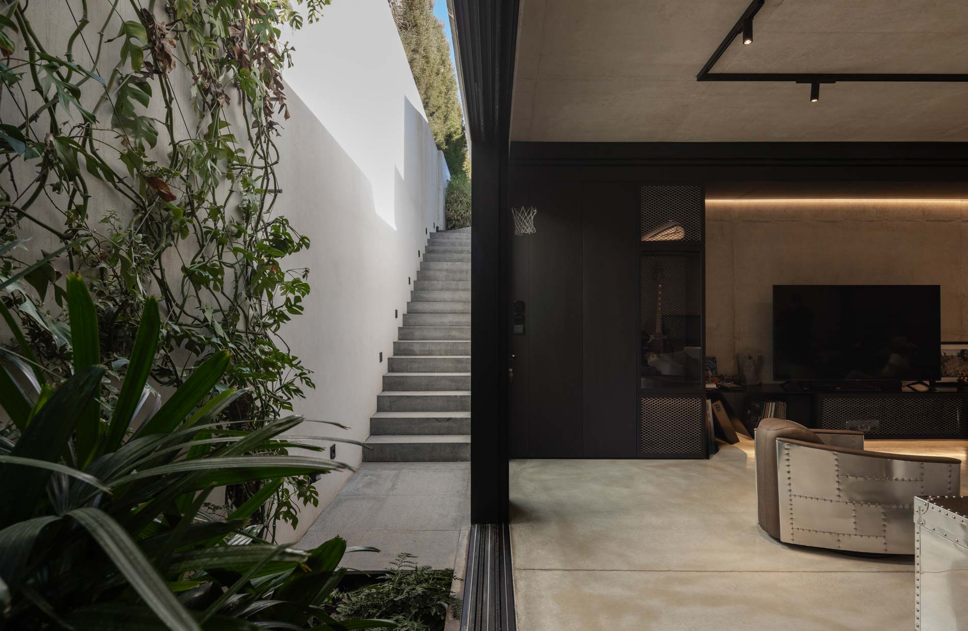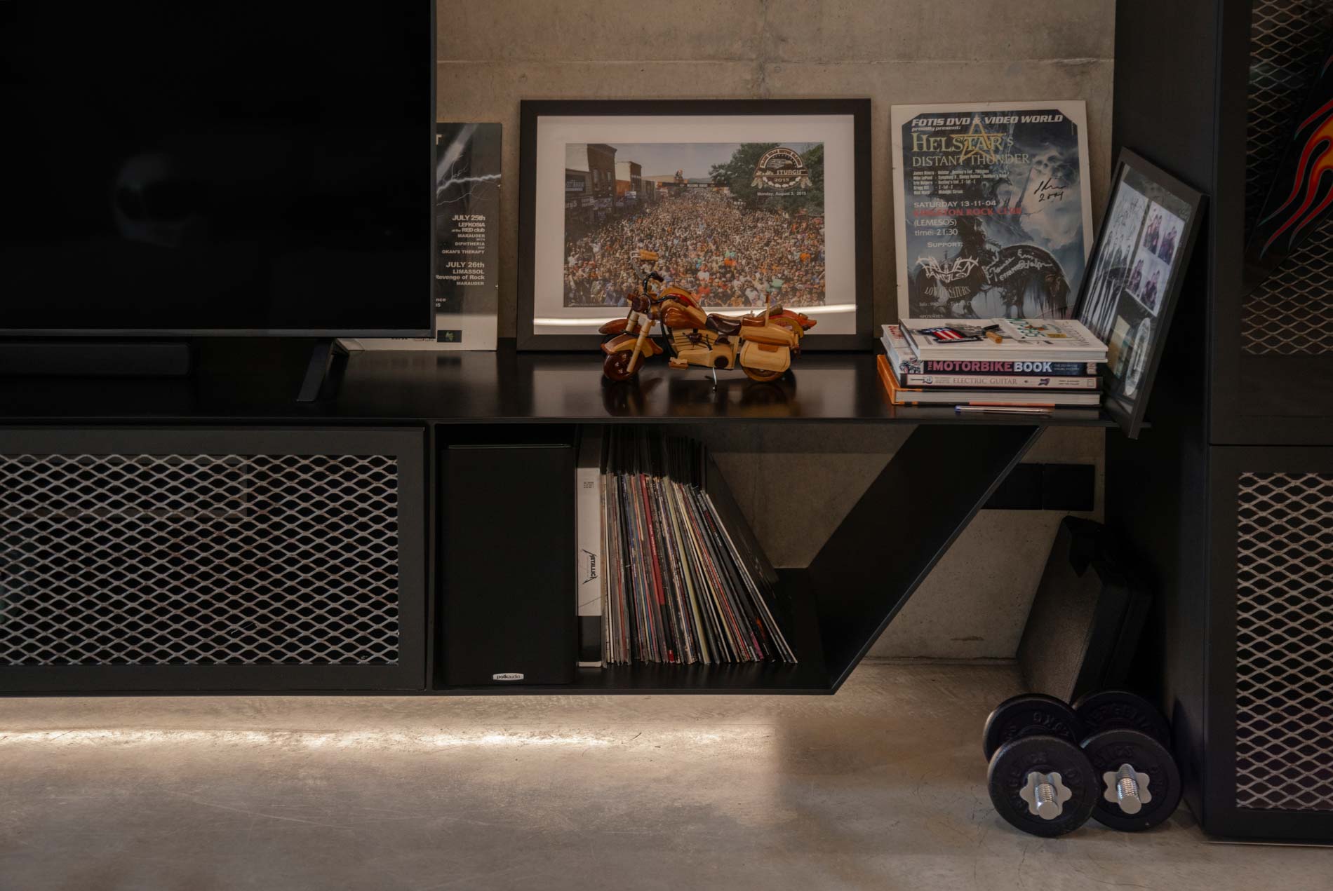 Description:This project involved renovating an existing building constructed in the 1980s and adding a contemporary extension. The ground floor and entrance, situated 2 meters above street level, provided an opportunity to create a lower ground living space and garage, featuring an exotic skylight planter at the rear boundary wall. The extension, made of fair-faced concrete, incorporates raw metal bespoke furniture to achieve an industrial design aesthetic, perfectly complementing the display of two limited edition Harley-Davidson bikes. The terrace above the extension is designed as a green roof with concrete planters and a waterfall fountain. In the existing building, we redesigned the layouts and provided comprehensive interior and lighting design services to modernize and enhance the living spaces.