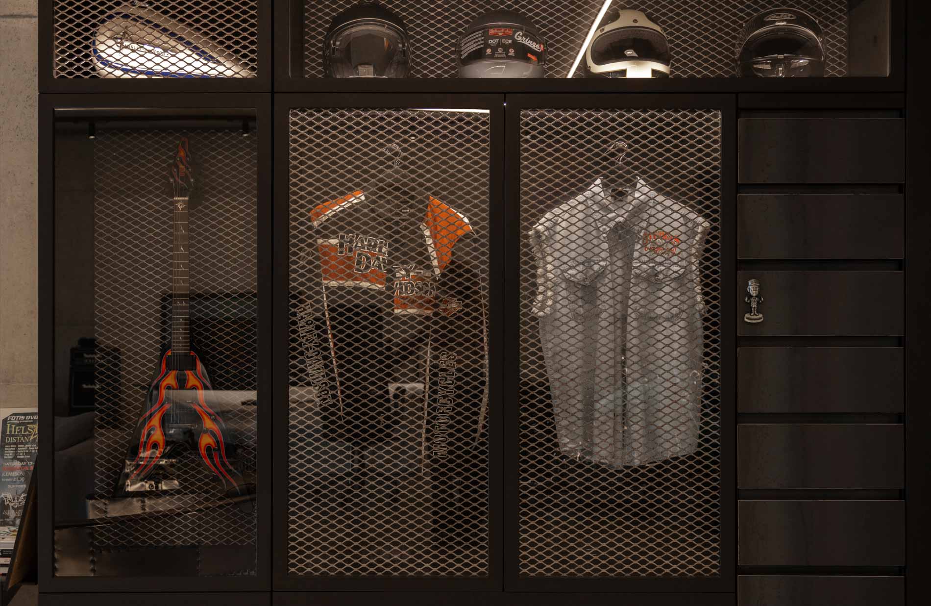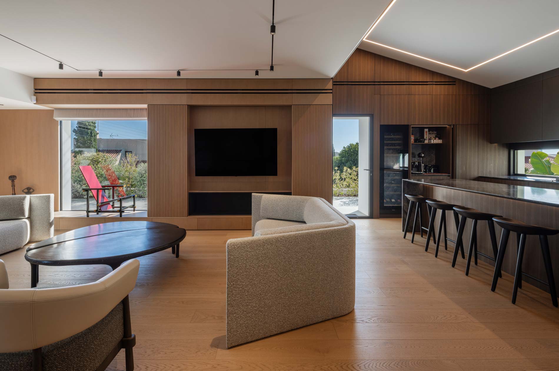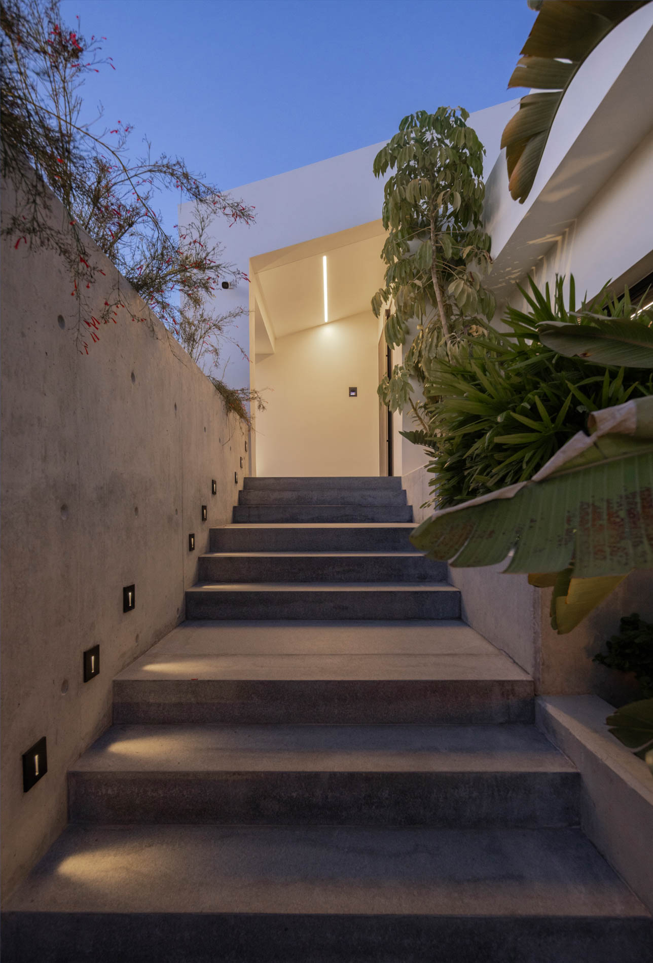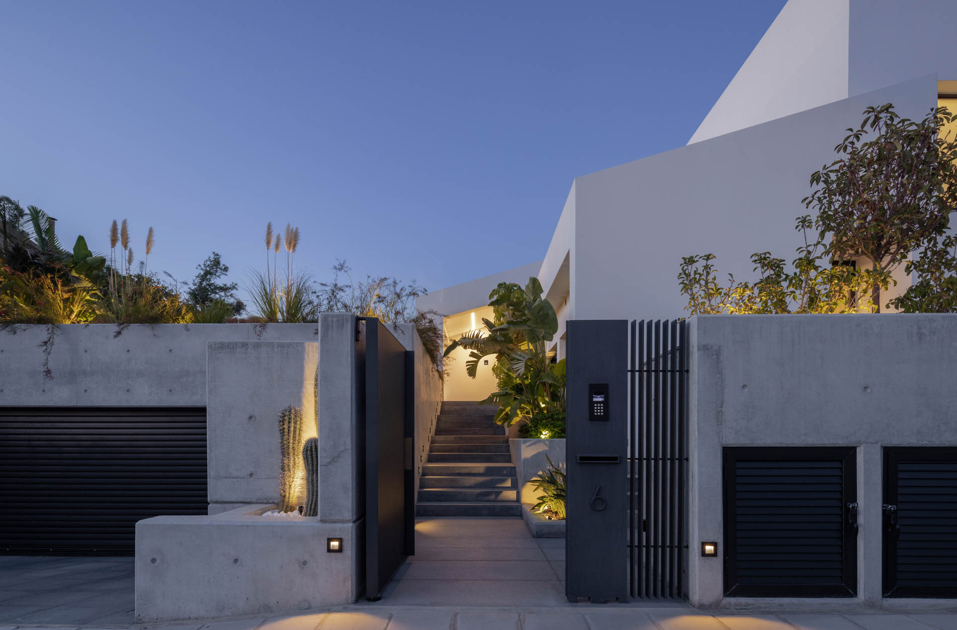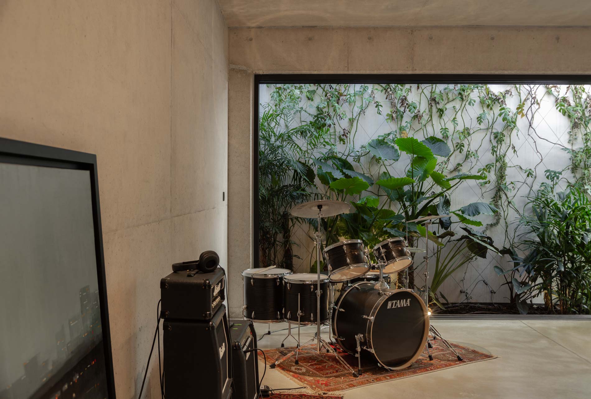 Description:This project involved renovating an existing building constructed in the 1980s and adding a contemporary extension. The ground floor and entrance, situated 2 meters above street level, provided an opportunity to create a lower ground living space and garage, featuring an exotic skylight planter at the rear boundary wall. The extension, made of fair-faced concrete, incorporates raw metal bespoke furniture to achieve an industrial design aesthetic, perfectly complementing the display of two limited edition Harley-Davidson bikes. The terrace above the extension is designed as a green roof with concrete planters and a waterfall fountain. In the existing building, we redesigned the layouts and provided comprehensive interior and lighting design services to modernize and enhance the living spaces.