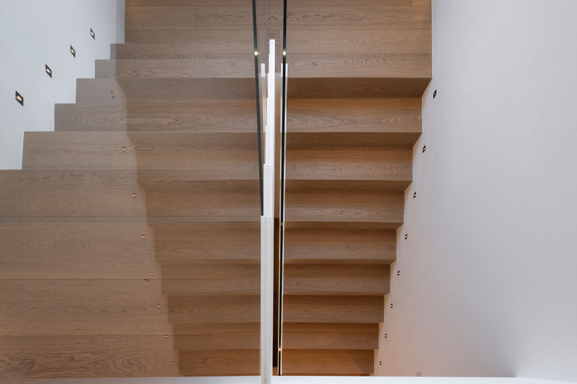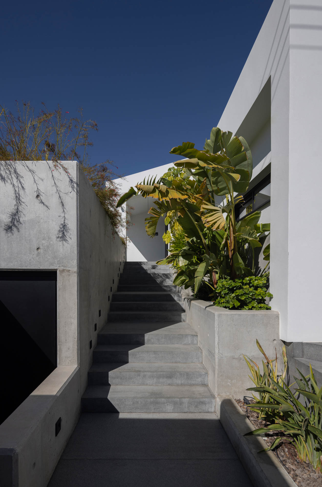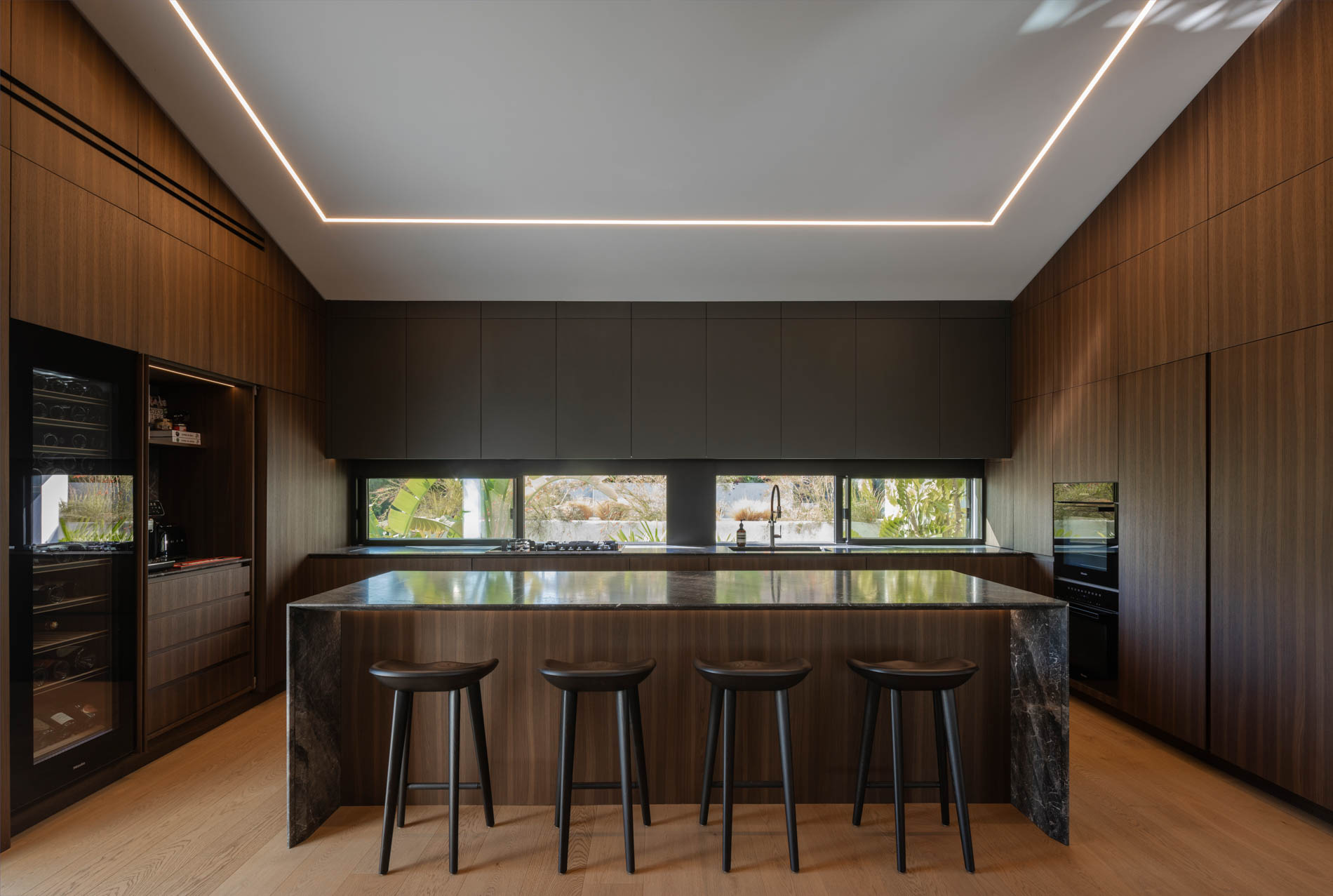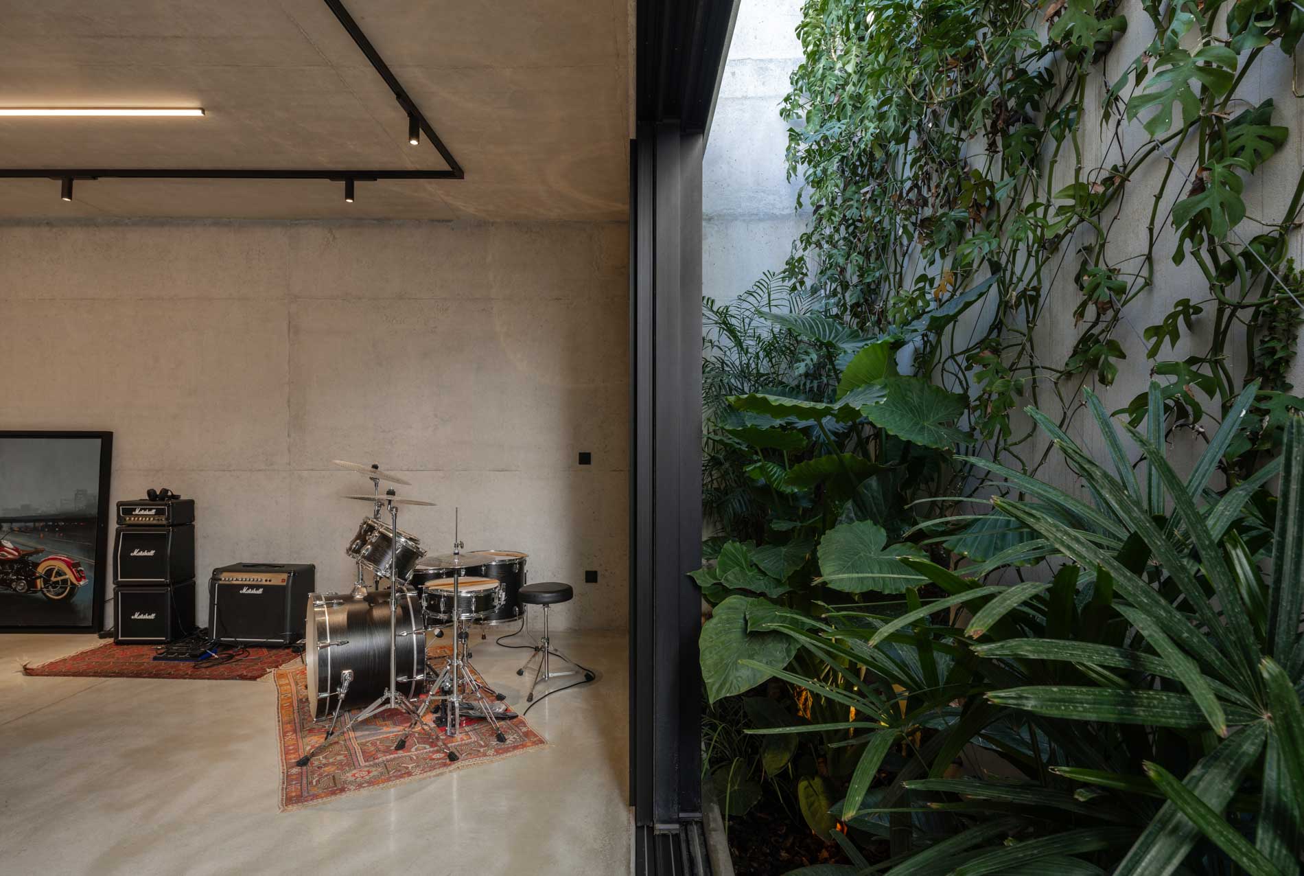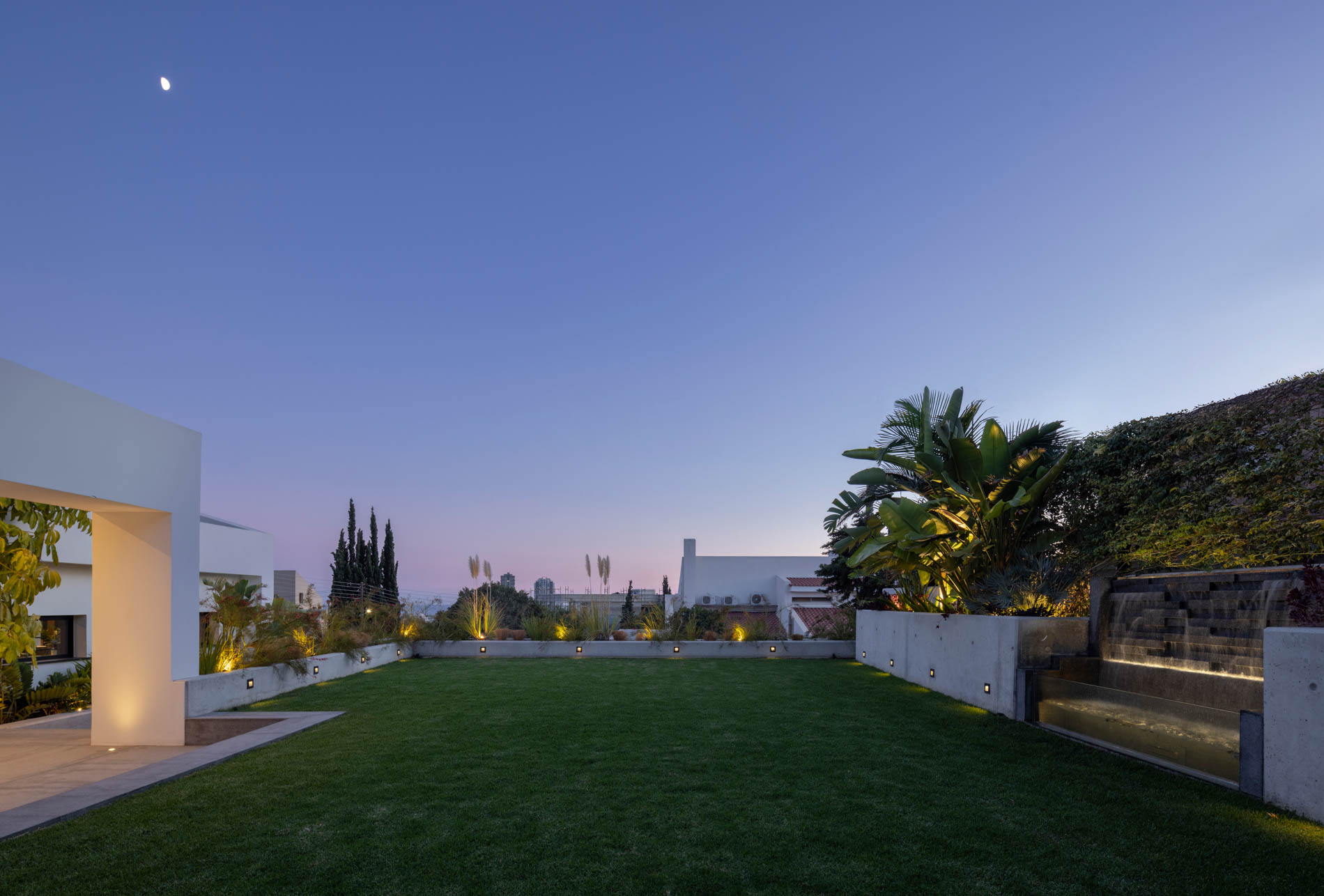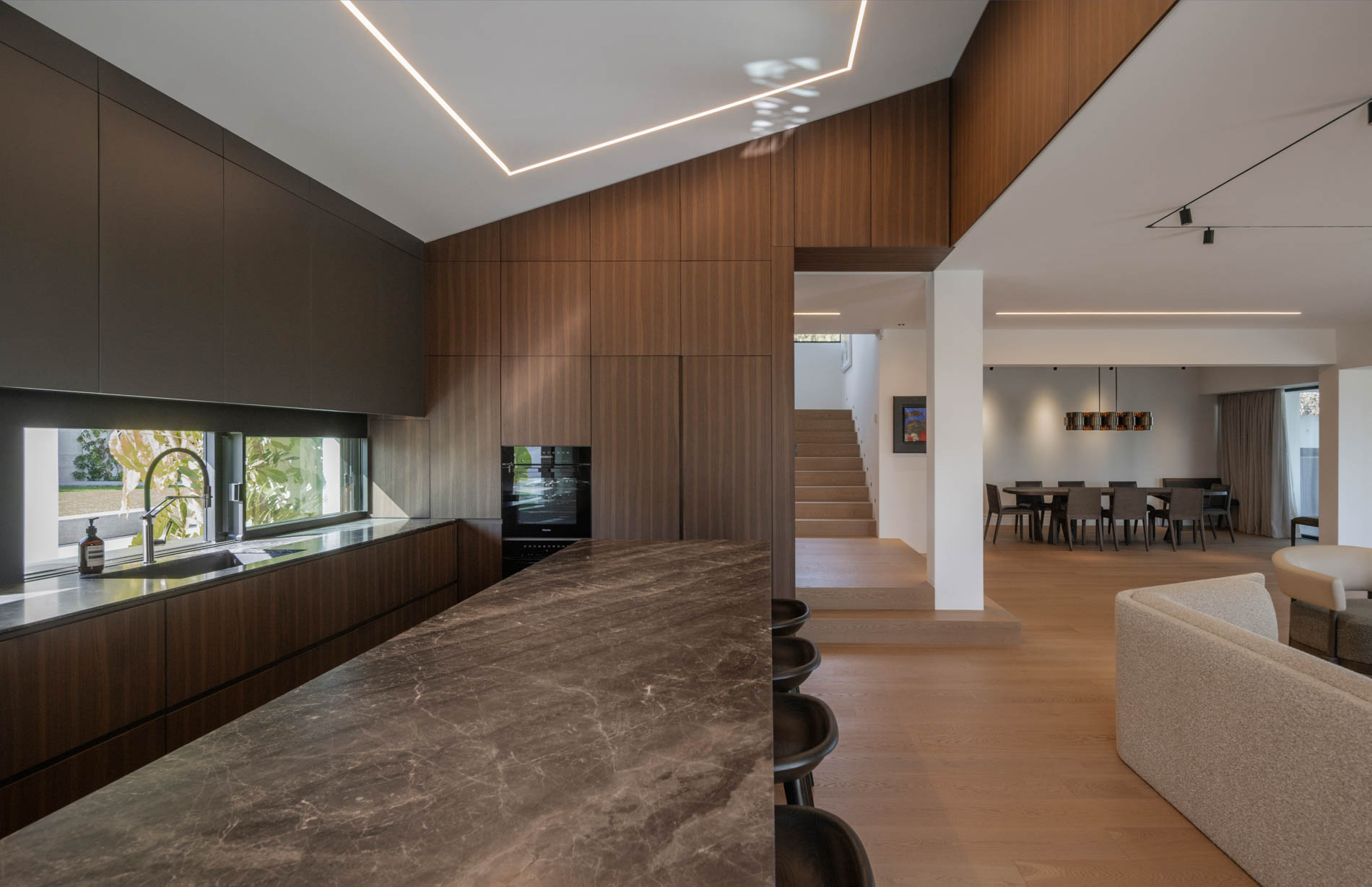 Description:This project involved renovating an existing building constructed in the 1980s and adding a contemporary extension. The ground floor and entrance, situated 2 meters above street level, provided an opportunity to create a lower ground living space and garage, featuring an exotic skylight planter at the rear boundary wall. The extension, made of fair-faced concrete, incorporates raw metal bespoke furniture to achieve an industrial design aesthetic, perfectly complementing the display of two limited edition Harley-Davidson bikes. The terrace above the extension is designed as a green roof with concrete planters and a waterfall fountain. In the existing building, we redesigned the layouts and provided comprehensive interior and lighting design services to modernize and enhance the living spaces.